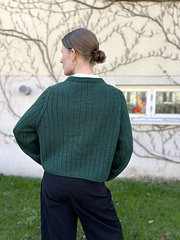 First, the back piece is worked back and forth with increases at each side. Next, stitches are pick up for the front pieces, which are shaped with short rows. Thereafter the yoke is joined and worked in the round while stitches for the sleeves are picked up along the long sides of the front pieces. Raglan increases are made on front, back and sleeves until armhole depth and circumference are reached. Then the body and sleeves are worked separately. All are finished with a short ribbing and Italian bind off. Lastly, neckline picked up and worked in rib, and subsequently folded double.