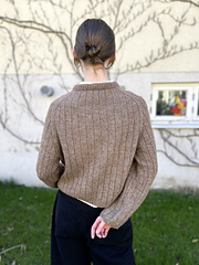 Greta sweater is worked top down in a rib structure. The sweater has a European shoulder construction which is combined with short rows and raglan increases to provide a good fit. The construction is highlighted by the ribbed structure, whose lines run uninterrupted throughout the sweater.
