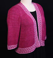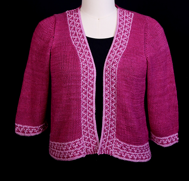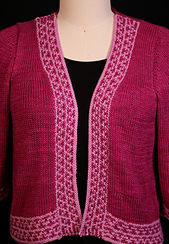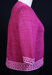 The shoulders are fitted, so the cardigan won’t slide down your back, but the body is knitted loosely in a silk/linen fiber that gives a wonderful drape and breathability. The prime features here are the decorative bands, which include attachment on both horizontal and vertical approaches. For more details, see the Special Topics in Finishing article in Cast On, Summer 2026.
