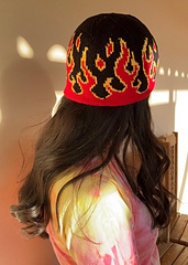 This pattern features a colorwork beanie inspired by flame motifs, worked in the round from the brim to the crown. The hat includes a full lining for extra warmth and structure, making it suitable for colder climates and giving the finished piece a polished, professional look.