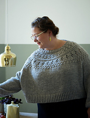 ヨークは深めに, 着丈はワンピースやハイウエストのボトムに合わせることを想定して短めにデザインしました. トップダウンのセーターなので編んでいる途中で試着してお好みの丈に調節することができます. 長めの着丈がお好みの場合は糸を多めに用意して, 身頃の丈を長めにアレンジしてみて下さい.