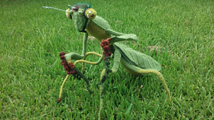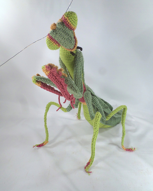 This is a fully articulated giant Praying mantis based loosely on *Stagmomantis carolina*. The crochet part of this project is very basic, though the assembly is quite involved. **There is a lot of written instruction to follow which requires dedication to complete**. I have included over 50 photos to help, but do expect an intense project. The second time around it will be much easier.
