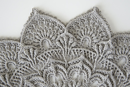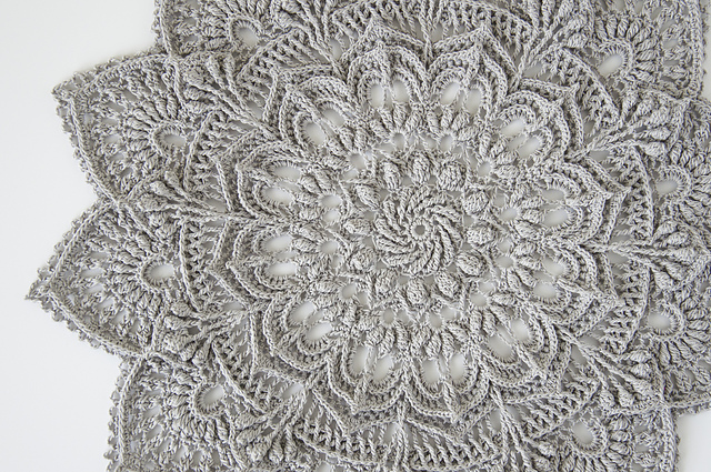 Your tension will determine things like hook size, yardage, finished size, and height of stitches. Using recommended thread and hook this pattern will use approximately 440-450 yards of thread. And your finished doily will be about 14’’ in diameter from point to point.