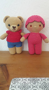 Teddy has the same trunk size as well as leg and arm width as the standard size Weebee doll, so he/she can wear all of the tops, trousers, dresses, sweaters etc from the Weebee doll outfit patterns!