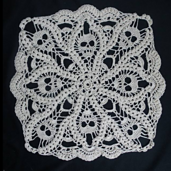 The funny name came about when my testers did not like so many popcorn stitches. (over 400 of them) So after much pondering over a name for this piece, we settled on "Death by Popcorn, a square skull doily".