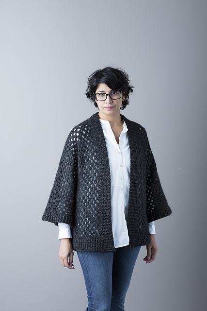 A stylish open-front cardigan, Hexa’s simple construction and customizable design make it great for both advanced beginners ready to try their first garment and experienced crocheters alike. Single-strand, unspun Icelandic Plötulopi makes it soft, light and warm.