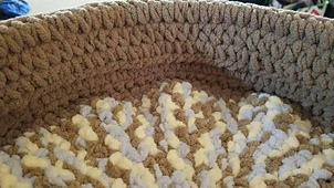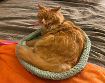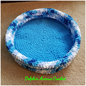 The Sleepy Kitty Bed is soft and made with Bernat Brights Blanket Yarn. I had 2 colors of the 10.5oz/220 yards blanket yarn from a previous project and used what was left. So it takes less then 220 yards of the yarn. I used colors Waterslide varg and Busy Blue.