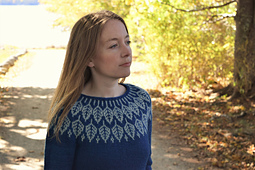 Arboreal is worked seamlessly from the top down. The stranded yoke is worked and then short row shaping is added on the back to shape the shoulders and neckline. The sleeves and body are separated and worked top down. Optional, gentle waist shaping makes for a feminine fit. It's fun and meditative to watch the leaves grow as the yoke is knitted. The chart is easy to follow and memorize and is suitable for a beginner, calling for only two colors. This design lends itself to many types of yarn and color combinations: Choose 2 colors for simplicity, create a faded effect in the yoke background, or simulate a turning leaves effect by creating a gradient with colors of your choice.
