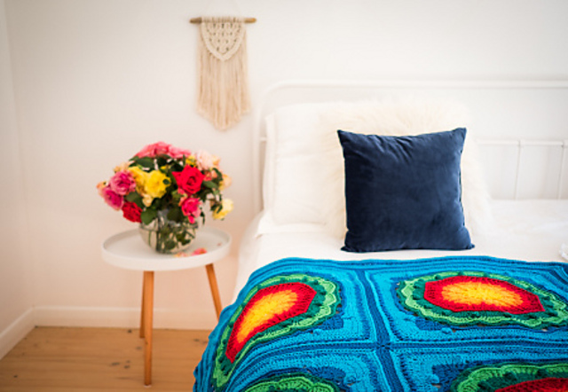 The blanket motif measures 20″ square. Four motifs will make a striking lap throw, six a blanket perfect for sharing and nine will make a spectacular blanket. This motif is equally beautiful made in one colour to show off the stitch work, or worked in multiple colours for a kaleidoscopic effect.