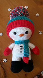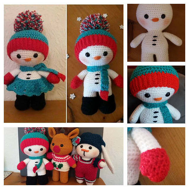 Weebee Snowman has the same legs and body shape as well as arm width as the [standard size Weebee doll][4], so he/she can wear all of the tops, trousers, dresses, sweaters, shoes, boots etc from all of the other Weebee doll outfit patterns - you can find them all [here in my Ravelry store][5].