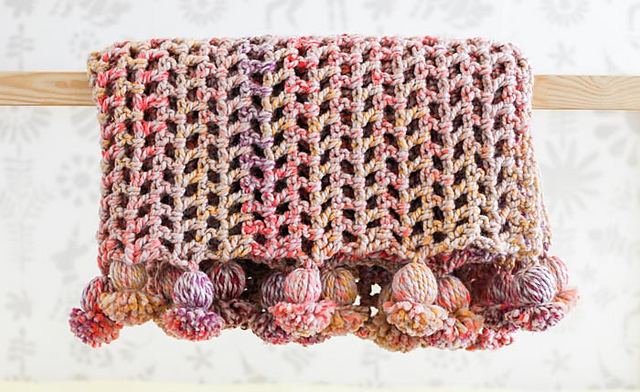 Using very basic chain and double crochet stitches, you’ll breeze through the body of the afghan in about three and a half hours and then add some pizazz with squishy tassels. This pattern is appropriate for confident beginners and anyone who likes to finish an entire afghan in a day!