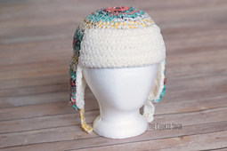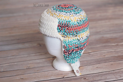 This hat is made with worsted weight yarn. You won't need 2 skeins' worth of yarn, but I recommend using 2 skeins just to make it easier (if your skein has a center pull, you can use both ends of the same skein, but it's more likely to get twisted). You will also need a size J (6.0mm) crochet hook and a tapestry needle. You'll need a small button to fasten the straps and can use optional large buttons for the front flap. (Instructions for the button and non-button versions are included, so you can pick whichever you prefer).