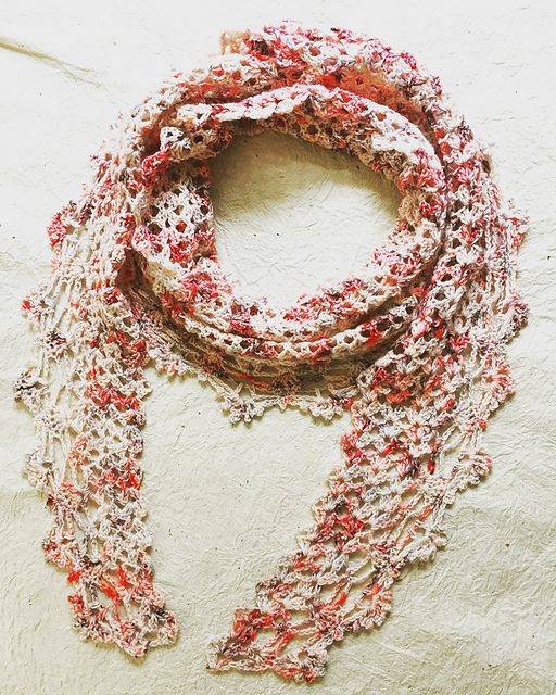 For my scarf I used Lone Star Arts Mockingbird Sock yarn in the colorway “Queen of Hearts” for my lacy romantic look. But, any solid color, hand-painted or speckle fingering or sock yarn you choose will produce a beautiful scarf for any occasion!