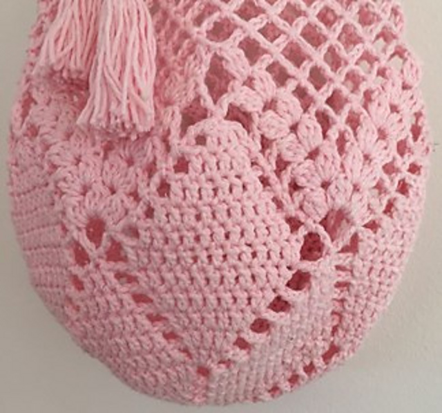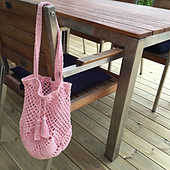 A market bag with a flower in the bottom. You can make it bigger by adding one more flower petal or use a thicker yarn, just remember to use the correct size of crochet hook for your yarn and that you probably will need a different amount of yarn.
