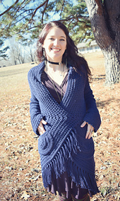 The circular body of the sweater is capped by shawl collar and straight sleeves, with chain cords that thread through the stitches of the fabric for a figure-flattering wrap at the waist. Simple construction makes this project suitable for Easy level crocheters, but it also features a few fun techniques including the double chain and the linked double crochet, both offered as free tutorials on my blog (links in the pattern)!
