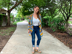 This blanket style wrap cardigan is so chic! It features a fantastic drape, a classy button closure, and a slimming asymmetrical line.