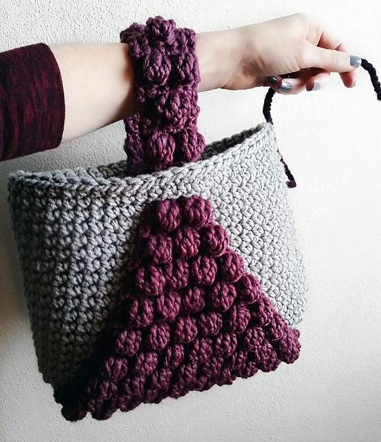 This crochet tote is made to bring your WIPs with you. It hooks on to your forearm so you can carry your working yarn in the tote and work on the go! Use super bulky size 6 yarn for the full size or worsted weight for a super small size. Pick two colors and start working!