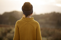 This cardigan is intended to be wide, cropped, and to hang bell-like from the shoulders. To fit as shown, it should be knitted with at least 10cm / 4in positive ease at the bust. Pick the size at least 10cm / 4in above your actual bust measurement, and if in doubt, select the next size up. Length can easily be added to the sweater to make it less cropped. Shown in the first size with 16.5cm / 6½in positive ease.