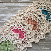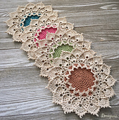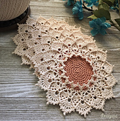 This doily has 19 rounds. Using 2 strands of size 10 crochet thread with a 3.25 mm hook can be substituted for the size 3.