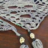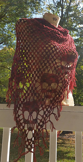 This triangle shawl is worked bottom up, revealing skulls along the outer edges. The detail of the skulls shows best in a solid or tonal yarn. Add fringe or tassels for a little something extra. Directions are given for a DK weight yarn, but this pattern is easily adjustable to make in any weight, larger or smaller. Have fun with it and make it your own!