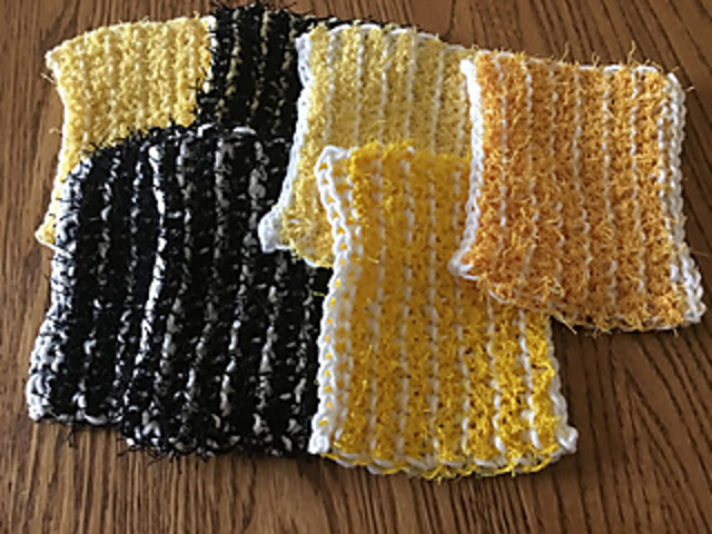 Use these double-sided scrubbies for the kitchen or the bath. One side is dishcloth cotton, the other is either cotton or polyester scrubby yarn. Make a different color for every day of the week.