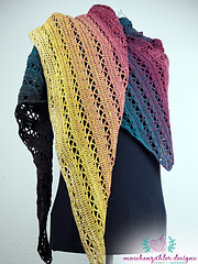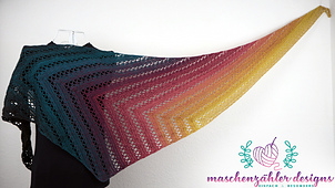 Achilles is an asymmetrical triangular shawl. It's eyecatching from and construction have the best effect when worked with a yarn with a very long colorrun or when crocheting stripes in different colors.