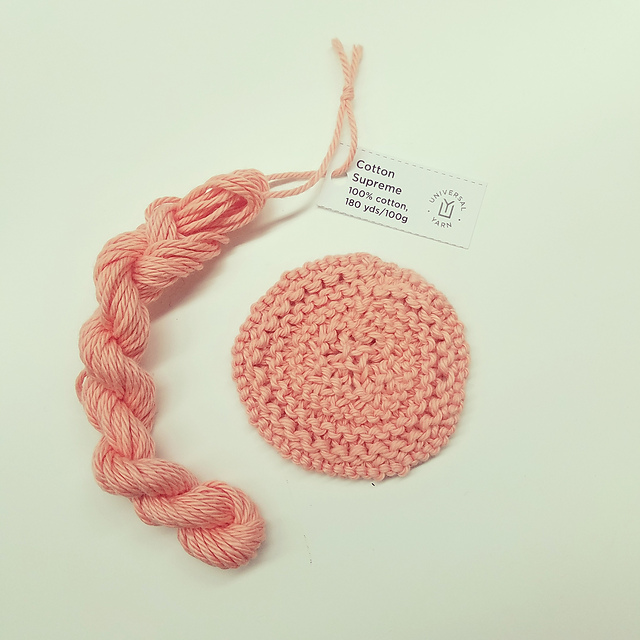 This round scrubbie is knit flat and seamed to create a circle. Measures 3" across