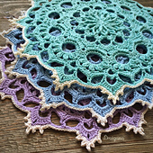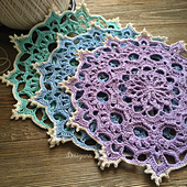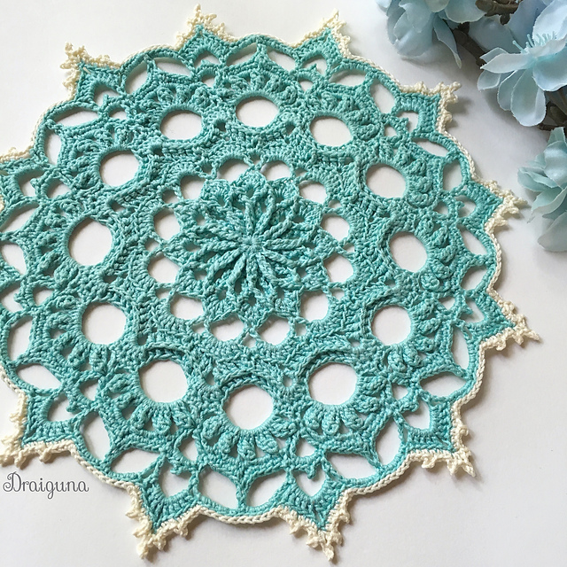 This doily has 16 rounds. Some of the stitches used are front post double crochet (fpdc), back post double crochet (bpdc), popcorn stitches, and picots.