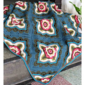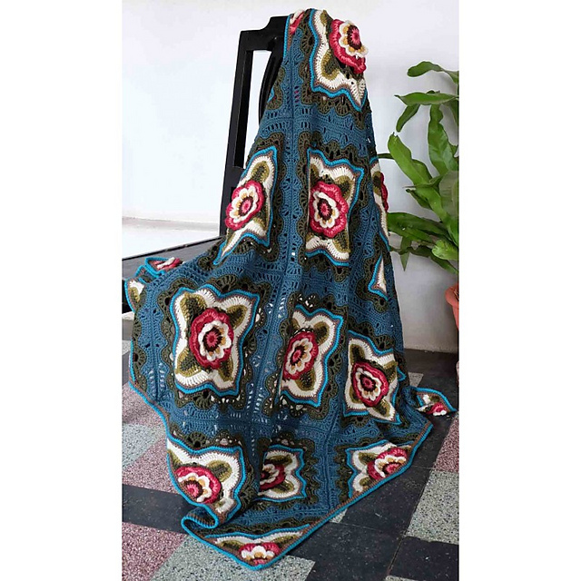 The design uses a mixture of DK weight yarns and a crochet layering technique to achieve the 3D effect of the flowers. A repeated square motif with central flower are combined with half and quarter motifs to achieve the square shape of the blanket.