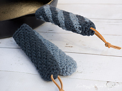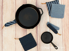 Crochet a cast iron handle cover and hot pad/potholder set for the dad that loves to cook! This easy, beginner-friendly pattern is quick to make and each piece uses only a small amount of yarn. If you want to make the entire set, you'll need two balls of the "super Size" Lily Sugar'n Cream in each color.