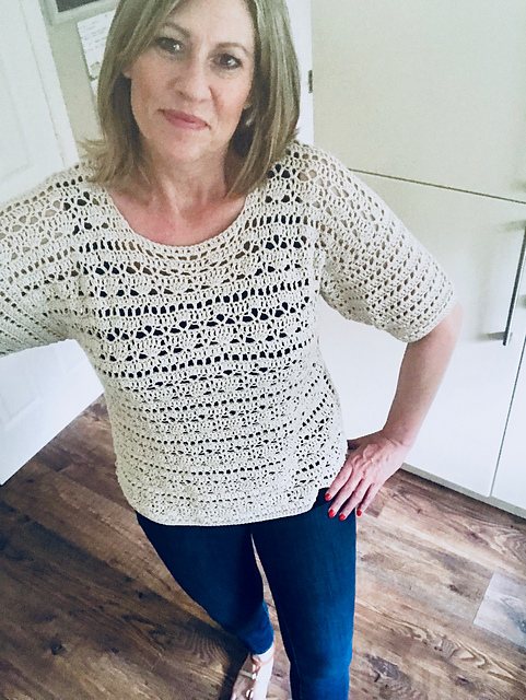 Pattern Note: extra length may be added to the body of the T at the point indicated in the pattern. For this option, an additional ball of yarn will be required. Also, if a cropped version is required, you may require less yarn