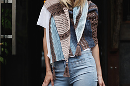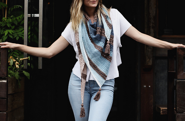 Designed as a fresh take on the ever-popular “Tea House Wrap,” the Earl Grey Wrap has a similar uneven striping broken up with simple lacework, but with a slightly asymmetric shape. A side-to-side construction highlights the painterly self-striping Mandala yarn and allows it to shine.