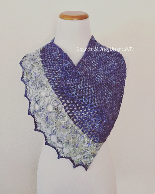 The scarf is crocheted flat and the rows are on the diagonal. The stitch pattern of the main section is an easy-to-memorize two-row repeat. Once you reach the specified stopping point, you crochet the lace section of nine rows. Then, I recommend wet blocking the scarf before sewing the final whip stitch seam to join in the round.