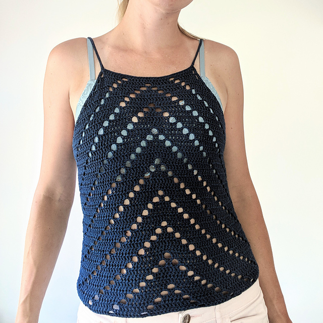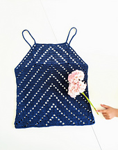 The top consists of a front and a back panel, worked from the bottom up and then stitched together at the sides. Finally, some finishing edging stitches and straps are crocheted.