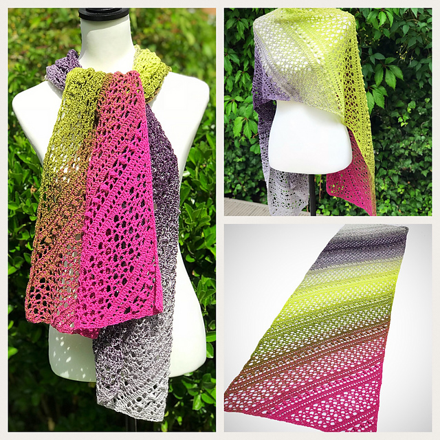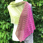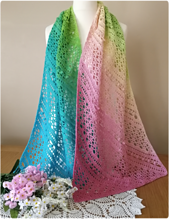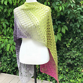 The texture of the bobbles slice through a sea of modern geometric lace panels, It's a visually stunning design which is worked diagonally into a rectangle wrap shape.