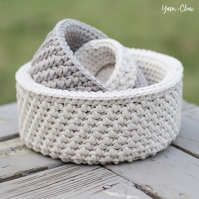 The mini bean stitch provides beautiful texture for the outsides of these nesting baskets, and plastic canvas provides a sturdiness that is easily obtained without killing your wrists with tiny hooks.