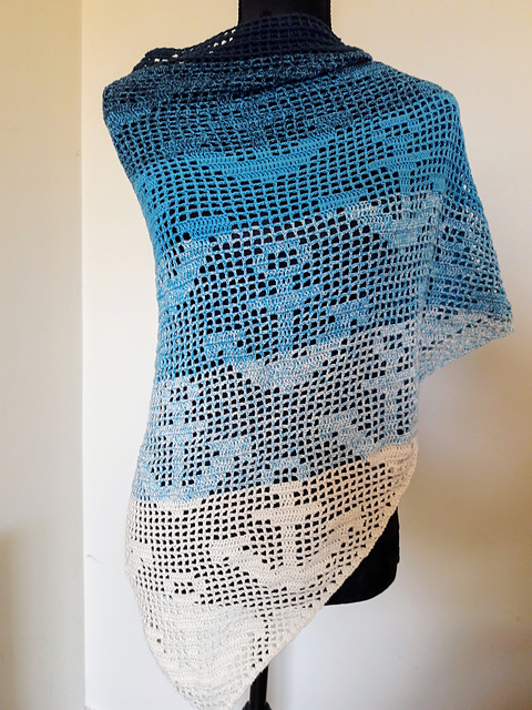 The shawl is made using the filet crochet method
