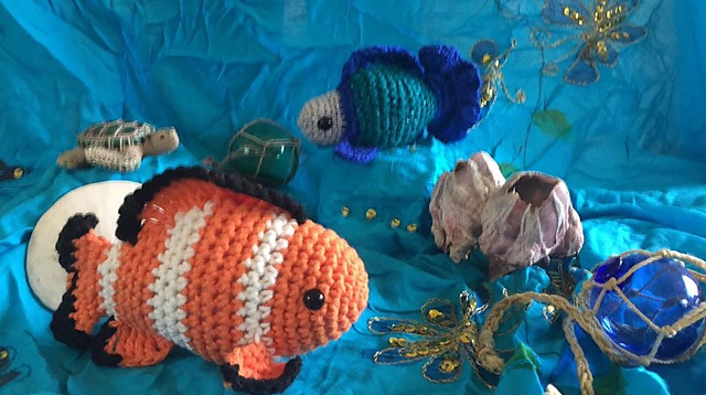 The body of the fish is made with single crochet. The fins are crocheted to the body. Stitches you should now for the fins: Half double crochet, double crochet and triple crochet.