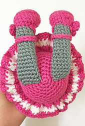 - Size 4 worsted weight yarn in colors of choice for animals (75g) and slippers/bows/outfit (75g)