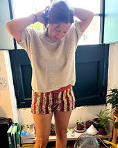 These shorts are constructed with four panels, sewn together, and then the top back and waistband are crocheted on the connected pieces. You will need a length of elastic in the size of your waist, or you could use a crocheted cord (it just won't be as comfortable.)
