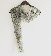 The scarf uses one skein of fingering or sock weight yarn of at least 430 yards, and is crocheted from side to side, starting at one tip and ending at the other tip of the scarf. The rows are crocheted on the diagonal with an easy to memorize stitch pattern. Then, without breaking the yarn, the scarf is turned and the tiny flower edging is added.