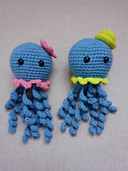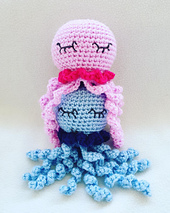 Made almost in one piece. You only need to add the ruffle later. In my pattern the tentacles are crocheted to the body, so it`s safer for little babies. I also didn`t use safety eyes. Instead the eyes can be embroidered or skipped at all.
