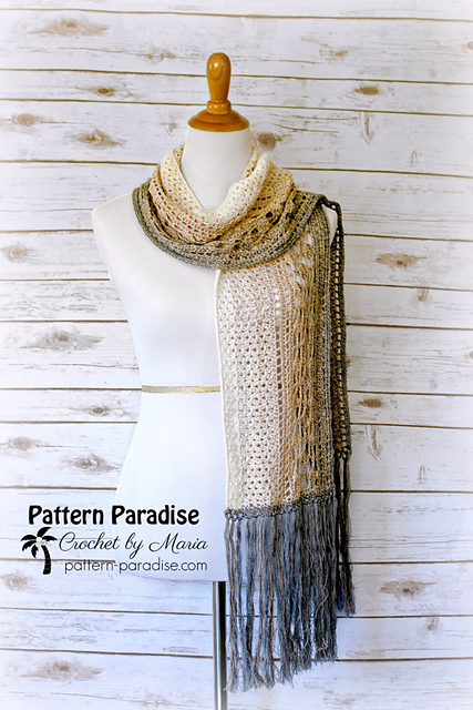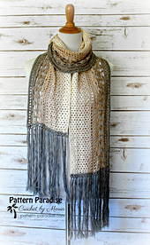 This pretty scarf is unique! It is worked side to side in a combination of lacy stitches, fillet and some a bit more closed off. I love the visual interest created by the combination of stitches in conjunction with the pretty color changes in the yarn. I added fringe for a bit of romantic elegance but it looks great without too!