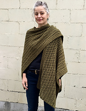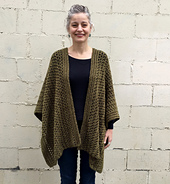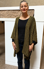 This ruana was made using LION BRAND YARNS Heartland 100% acrylic yarn, weight: Medium 4 (5 oz / 142 g / 251 yd / 230 m).