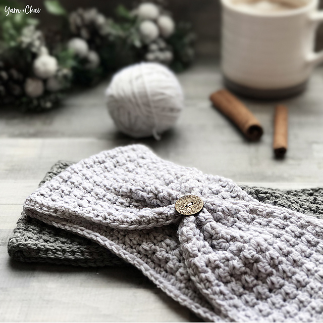 This earwarmer is easy and quick. Don’t let the #3 DK weight yarn fool you; it will work up fast, and still feel light on your head. The seam is conveniently hidden underneath the button, and although I am totally ok with a necessary seam, I always get excited when I find a good hiding place for it!