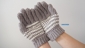 These cozy striped crochet gloves are a must have this winter. Bernat Blanket Tiny creates what feels like little clouds on your hands! currently, this pattern is available in a one-size-fits-most women. Do a couple measurements of your hands to make sure the sizing is right for you! Some modifications to size can be made for a more custom fit if necessary. Finger length and band circumference can be easily modified to fit you. Adjustments that need to be made within the hand will effect the shaping and will require changes in stitch count.
