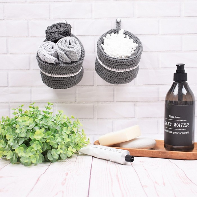 Small, pretty hanging baskets – perfect for storage in the bathroom or the office. They are crocheted in Rainbow Cotton 8/4 double thread or 8/8 single thread. A quick, little project.