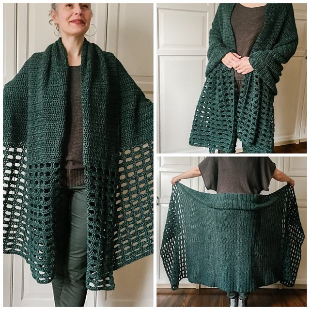 I LOVE this boho wrap. Is is stylish, VERSATILE and a little something different. It's **one big simple rectangle**. It wears like a cape, a ruana or a blanket shawl, AND, you can fold over the top to get even more looks.