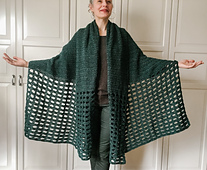 The main stitch is double crochet. The “lacey” border rows at the top and at the bottom of the wrap consist of double crochet stitches and chain spaces.