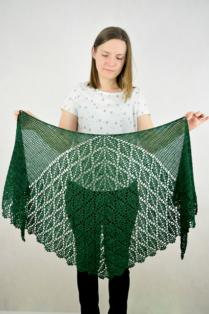 Serrate Shawl has such an unusual construction, worked from the centre top down in one piece. With its lace leaves central panel and plain sides, it is simple enough for a lace beginner to crochet, not boring for crocheters with more experience. This is a relatively quick and relaxing project that has been found to be completely addicting.